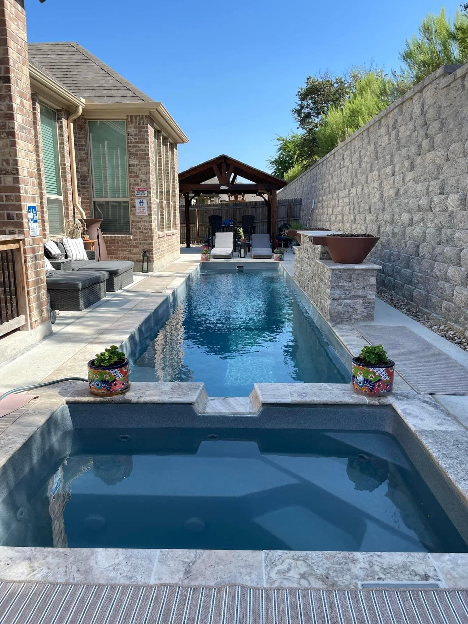 Introducing The Marathon with Spa — a rectangular lap swimming pool. At 57 inches deep and 39 feet long, the fiberglass pool can comfortably handle two lap swimmers, while its spa seats two to four.