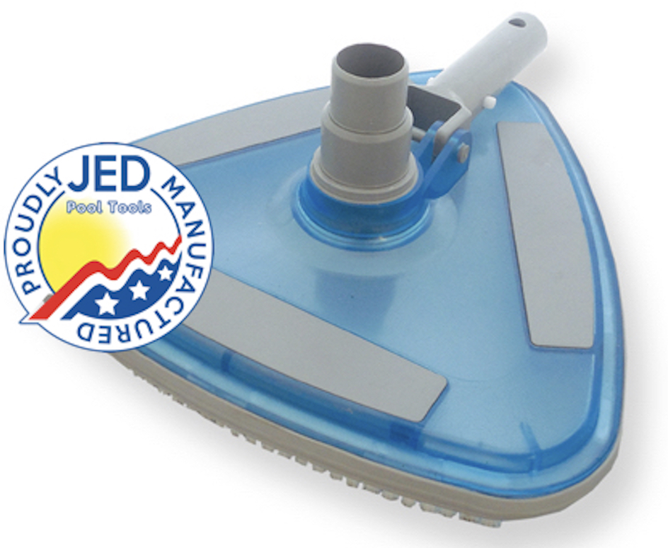 JED Pool Tools’ clear vacuum head allows users to see the bottom of the pool while cleaning. Its triangular shape makes it easy to clean corners and steps, and the perimeter bumpers protect pool liners. The U.S.-made vacuum head features long-wearing brushes that quickly loosen tough algae spots and a 360-degree swivel connector that avoids hose tangling.